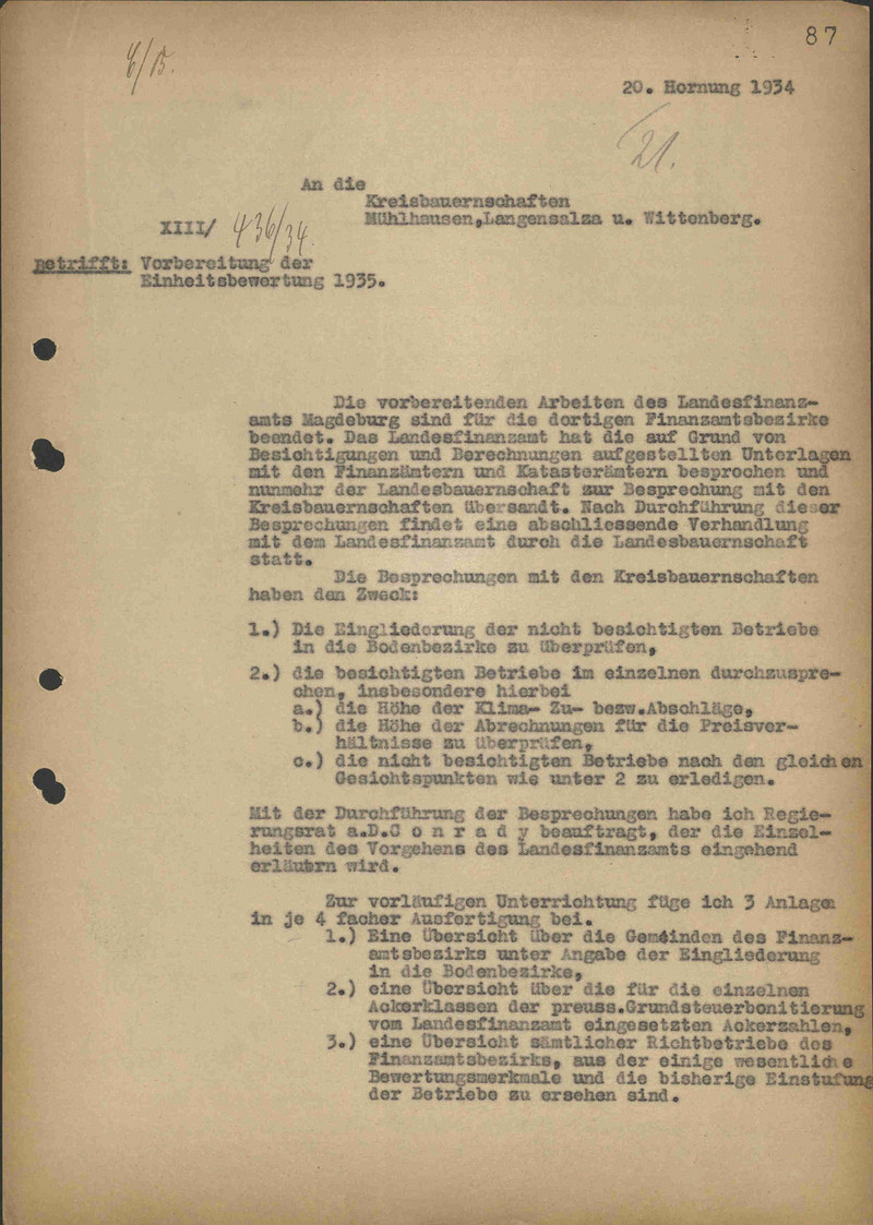 Warum die Einführung des Einheitswertes ursprünglich einen großen Fortschritt darstellte, welcher Aufwand damit einherging und wieso einem Ort im heutigen Sachsen-Anhalt dabei eine reichsweite Vorbildfunktion zukam, präsentiert eine neue Vitrinenausstellung am Standort Magdeburg. Zugleich erhalten die Besuchenden Einblicke in die archivalische Überlieferung der Landesbauernschaft Sachsen-Anhalt.